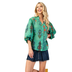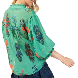 Elevate your wardrobe with this exquisite green floral printed button-down blouse. The playful puff sleeves add interest while maintaining a refined silhouette. Crafted with attention to detail, this versatile piece transitions effortlessly from professional settings to evening affairs, embodying timeless femininity with a contemporary twist.