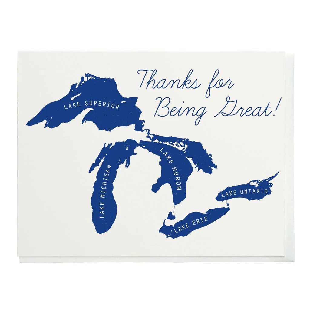 This humorous and charming Great Lakes letterpress card is the best way to thank any fan of the Great Lakes, or tell them why they’re special. The card comes with a coordinating envelope. Produced by City Bird and made in Michigan. Size: 4" x 5.5” Process: letterpress. Interior printing: blank inside.