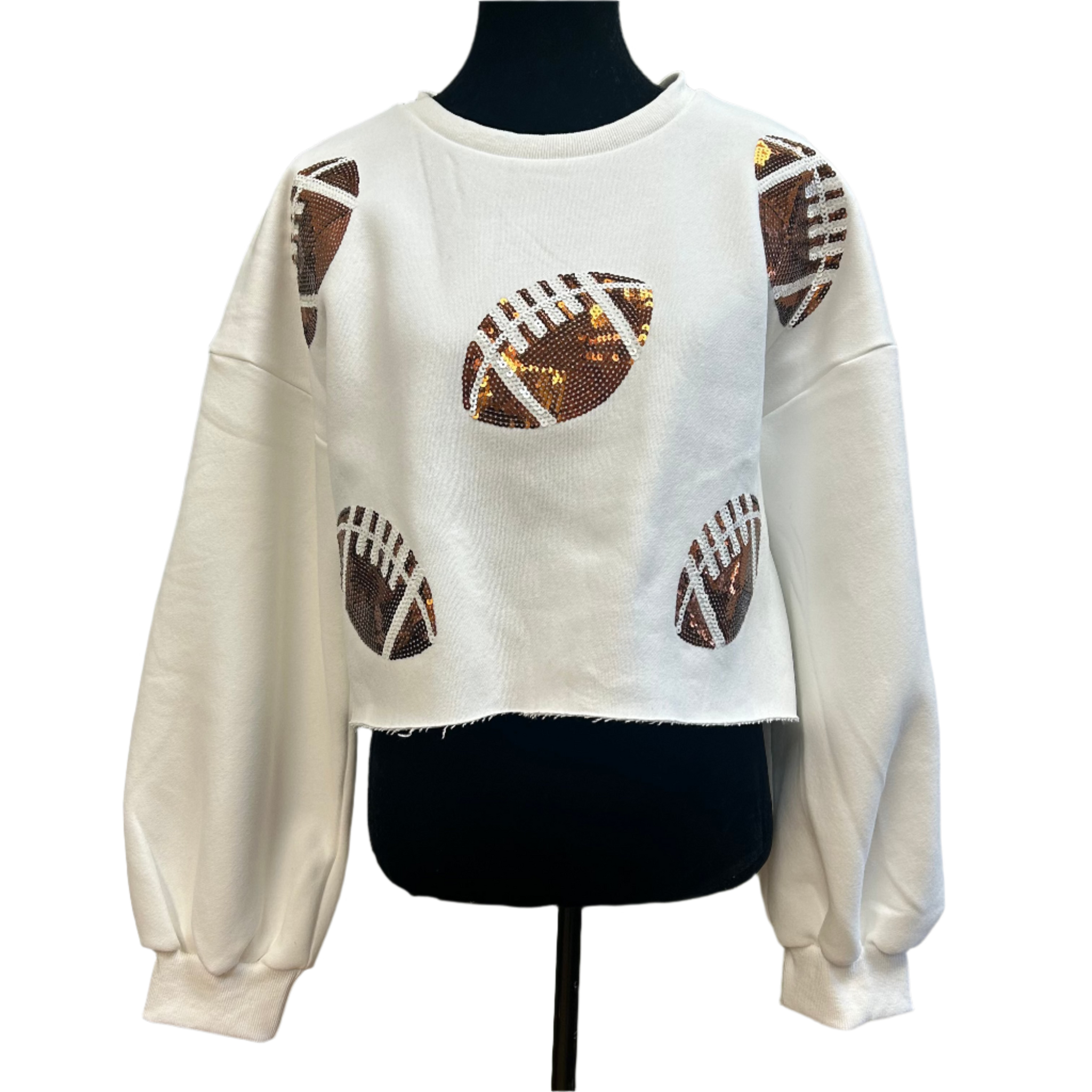 Get ready to sparkle on game day with this sequin cropped sweatshirt! Its playful shimmer and comfy fit make it perfect for cheering on your team in style. Show your spirit while staying cozy and cool.