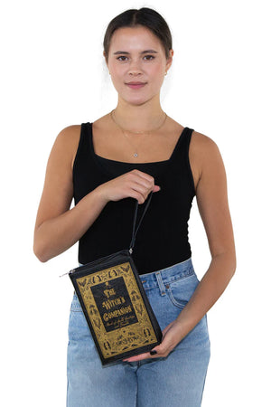 The Witch's Companion Book Clutch Bag is crafted from quality vinyl with a playful, unique design that stands out. It features a convenient 21.5" shoulder strap and a 5.5" wristlet strap for versatile carrying options. The secure zippered closure keeps your essentials safe inside the fabric-lined interior, which includes two compartments and a zippered pocket to keep you organized. Compact yet roomy, it measures approximately 6" L x 2.5" W x 9.5" H—perfect for adding a touch of magic to any outfit!