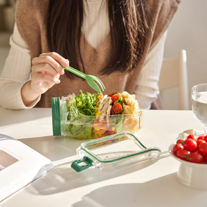 The Salad Pod is a leakproof, portable container with the ability to do vertical layers to keep your salad fresh and crisp. Its ergonomic design lets you easily mix and enjoy meals on the go, with a convenient front hatch that transforms it into a salad bowl.
