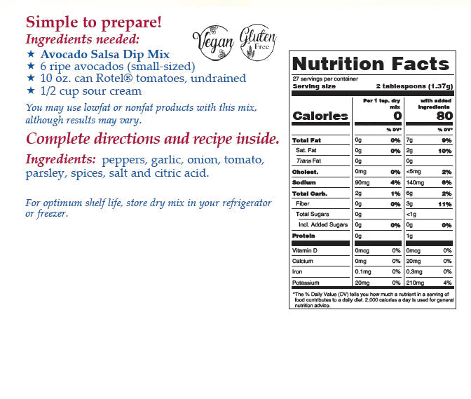 Craving a flavor explosion? Our Avocado Salsa Mix is the ultimate flavor fusion, blending the creaminess of avocado with the zesty kick of salsa. Enjoy it as a dip, topping, or straight off the spoon - this versatile salsa elevates any snacking experience. No dairy products required to complete this mix.
