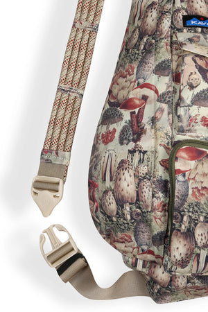 Sling pack with adjustable rope shoulder strap and side release buckle, elastic webbing keeper at strap end, two vertical zip compartments, two key or cell phone pockets, padded back with KAVU embroidery.