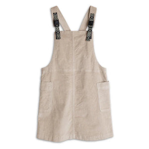 Relaxed fit jumper dress, adjustable webbing shoulder straps and buckle closure, two side patch pockets, length hits mid-thigh.