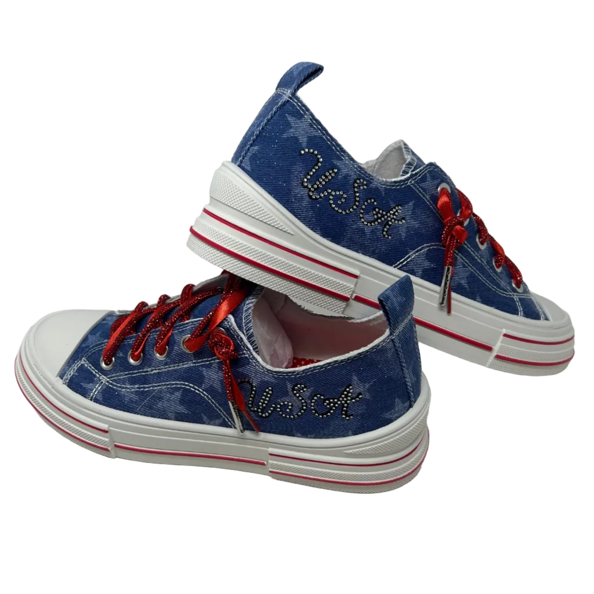 Show your patriotic spirit iin the Aman USA Sneakers. Denim blue color, white stars, red sparkle & ribbon laces with USA adorned in clear rhinestones. They are the perfect footwear to show off your spirit.