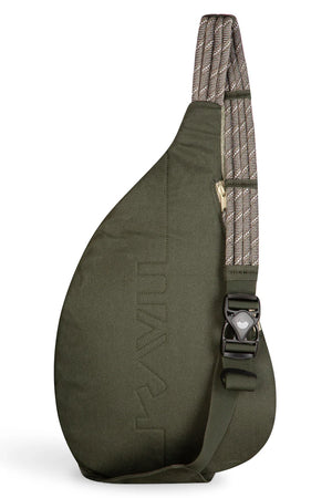 Sling pack with adjustable rope shoulder strap and side release buckle, elastic webbing keeper at strap end, two key or cell phone pockets with pattern webbing detail, exterior back zip pocket, interior d-ring key chain loop, padded back with KAVU embroidery.