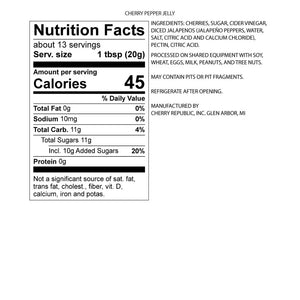 Elevate your spread with our Cherry Pepper Jelly, infused with hot and mild peppers that transform any snack into gourmet hors d'oeuvres. Serve with brie, cream cheese, or as a dip. The marvelous flavor of cherries add the unique taste of Northern Michigan to any appetizer. Made in Glen Arbor, Michigan by Cherry Republic. Net wt. 9oz.