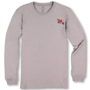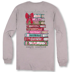 Driftwood grey long sleeve shirt with the phrase 'One more chapter please' and a stack of Christmas themed books. Simply Southern logo below. Similar design on left chest. 100% cotton. Unisex sizing.