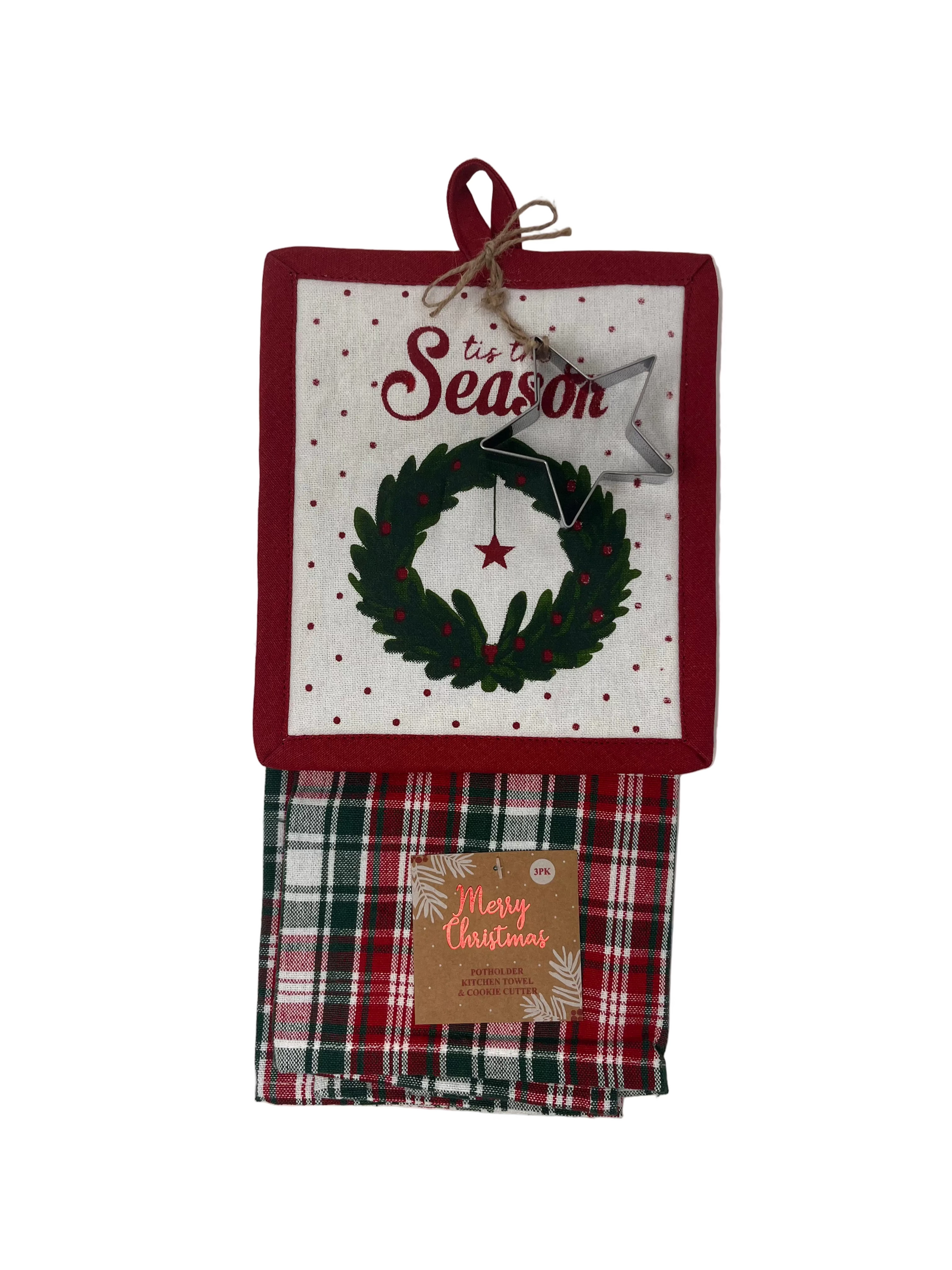 Spread holiday cheer with this festive three-piece set! Perfect for bakers and home cooks, it includes a cheerful Christmas pot holder to protect your hands, a coordinating kitchen towel for everyday use, and a fun cookie cutter to create seasonal treats. Ideal for gift-giving or treating yourself to a touch of seasonal warmth in the kitchen.